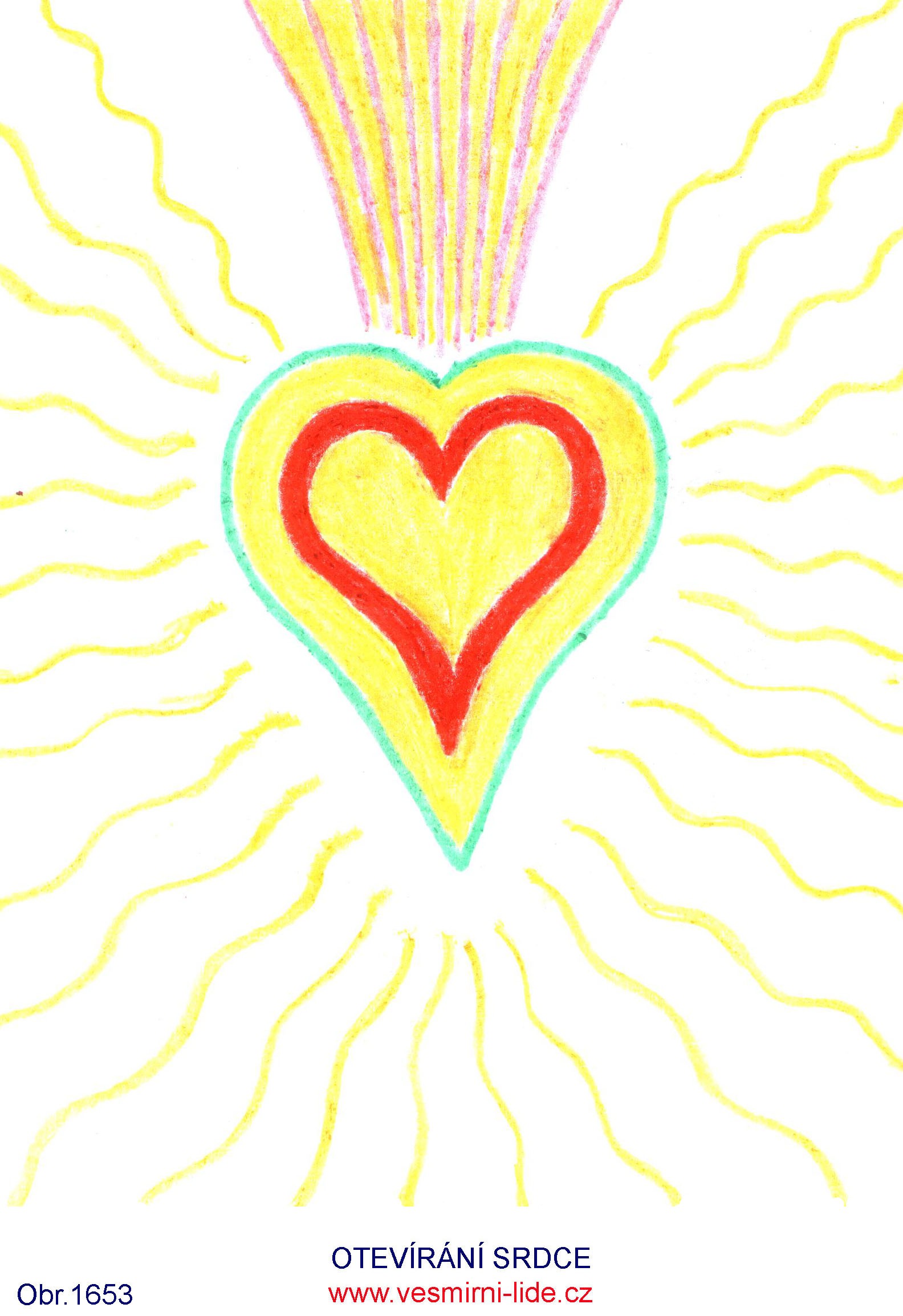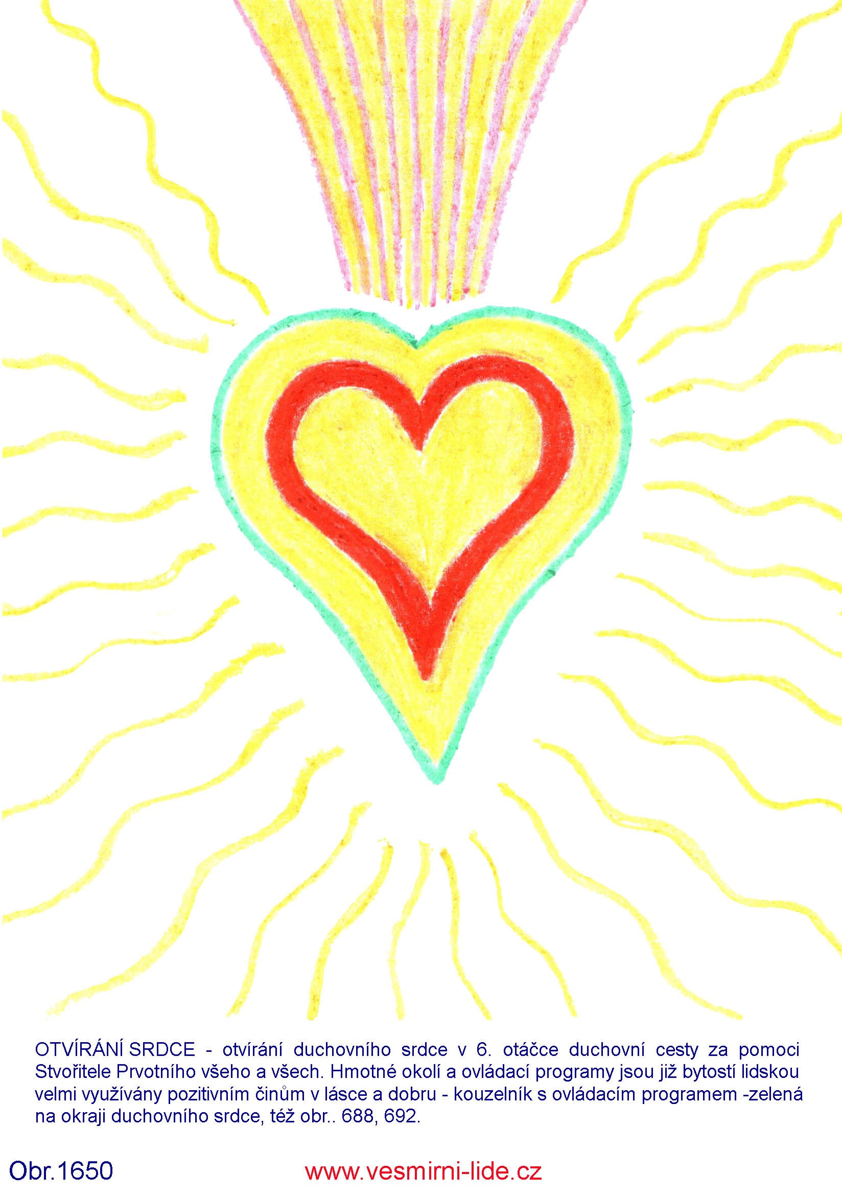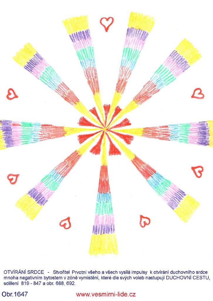 „Zásadní podmínkou vzestupu pro každého člověka v DUCHOVNÍ CESTĚ - sdělení 819 – 847 a obr. 688, 692 je OTVÍRÁNÍ DUCHOVNÍHO SRDCE – srdečnost, láskyplnost, upřímnost, vnímavost (4. srdeční čakra). Zde máte některé další účinné pomůcky k tomuto procesu – obr. 1647 – 1658 (kreslil Ivo), 1680 – 1682 (kreslila T.). Pohledem na ně (10 a více minut) iniciujete otvírání svého srdce zaměřením svého vědomí na tuto klíčovou informaci propojovacím procesem.