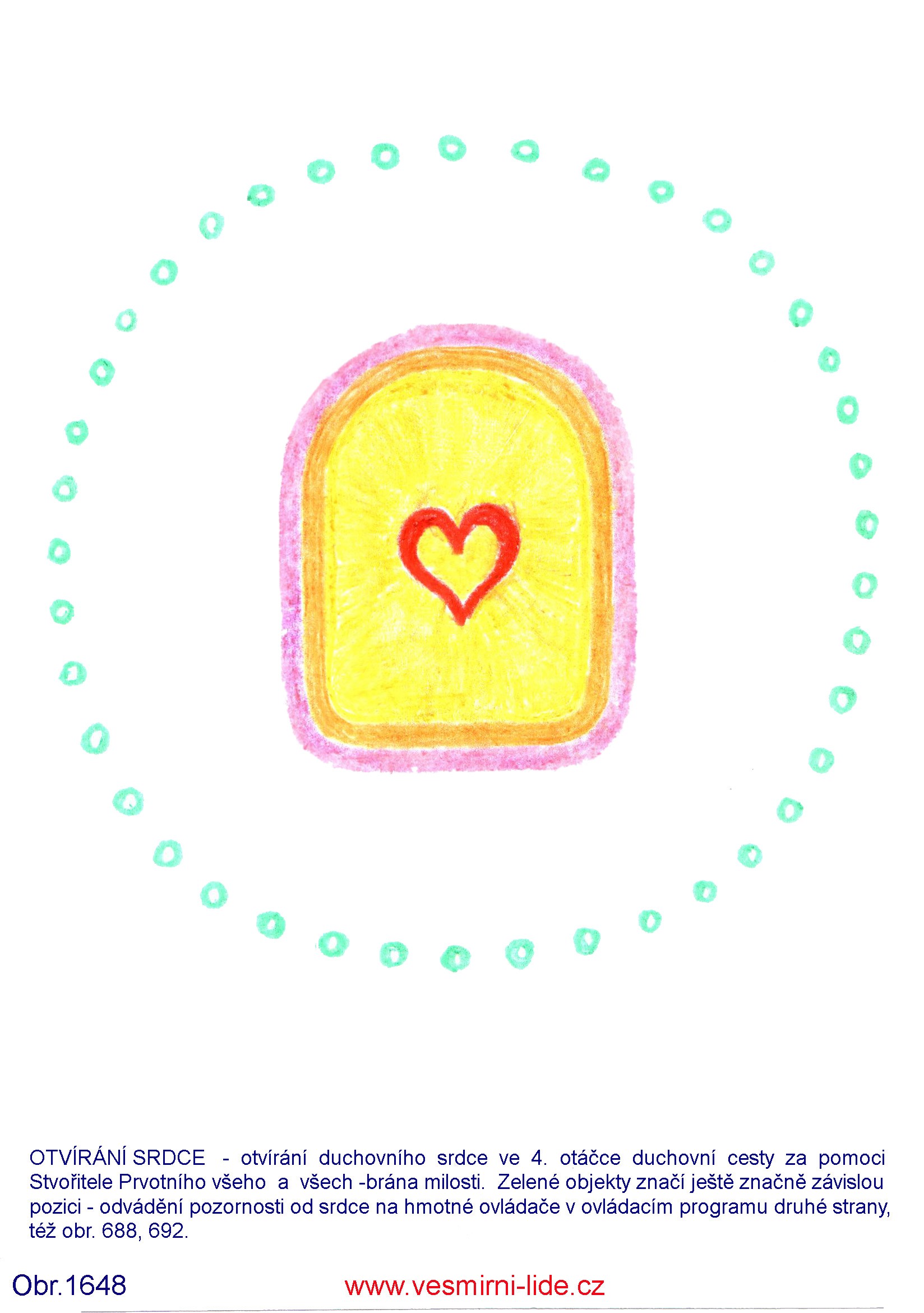 OTVÍRÁNÍ SRDCE – otvírání duchovního srdce ve 4. otáčce duchovní cesty za pomoci Stvořitele Prvotního všeho a všech – brána milosti. Zelené objekty značí ještě značné závislou pozici – odvádění pozornosti od srdce na hmotné ovládače v ovládacím programu druhé strany, též obr. 688, 692.