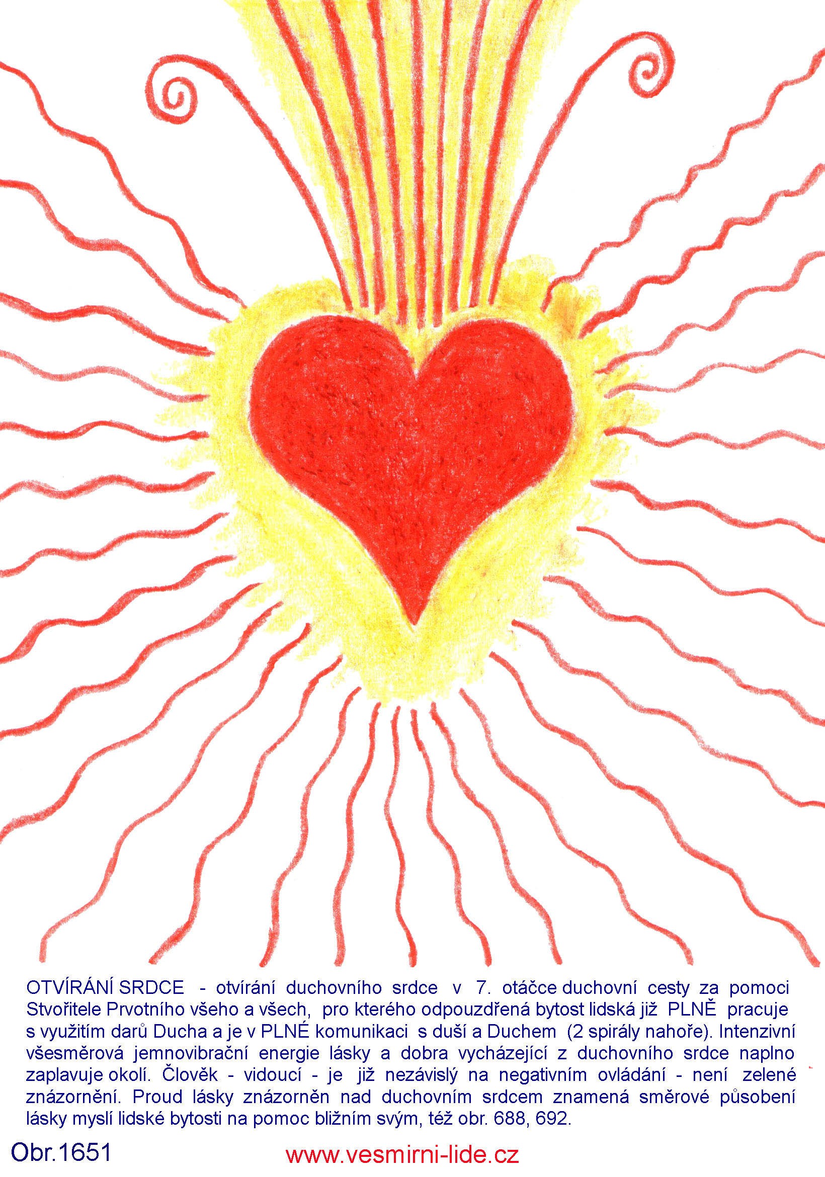 OTVÍRÁNÍ SRDCE – otvírání duchovního srdce v 7. otáčce duchovní cesty za pomoci Stvořitele Prvotního všeho a všech, pro kterého odpouzdřená bytost lidská již PLNĚ pracuje s využitím darů Ducha a je v PLNÉ komunikaci s duší a Duchem (2 spirály nahoře). Intenzívní všesměrová jemnovibrační energie lásky a dobra vycházející z duchovního srdce naplno zaplavuje okolí. Člověk – vidoucí - je již nezávislý na negativním ovládání – není zelené znázornění. Proud lásky znázorněn nad duchovním srdcem znamená směrované působení lásky myslí lidské bytosti na pomoc bližním svým, též obr. 688, 692.