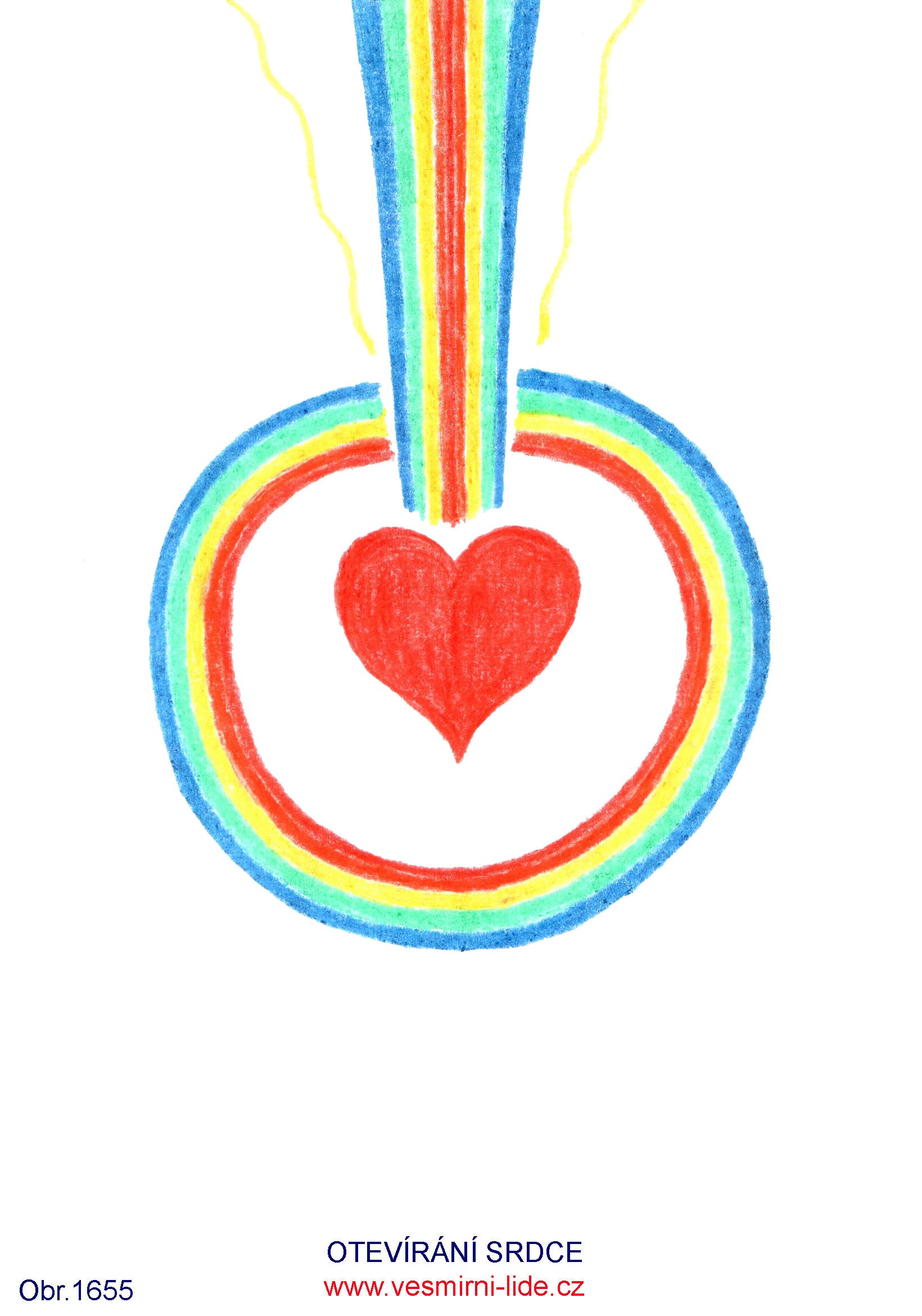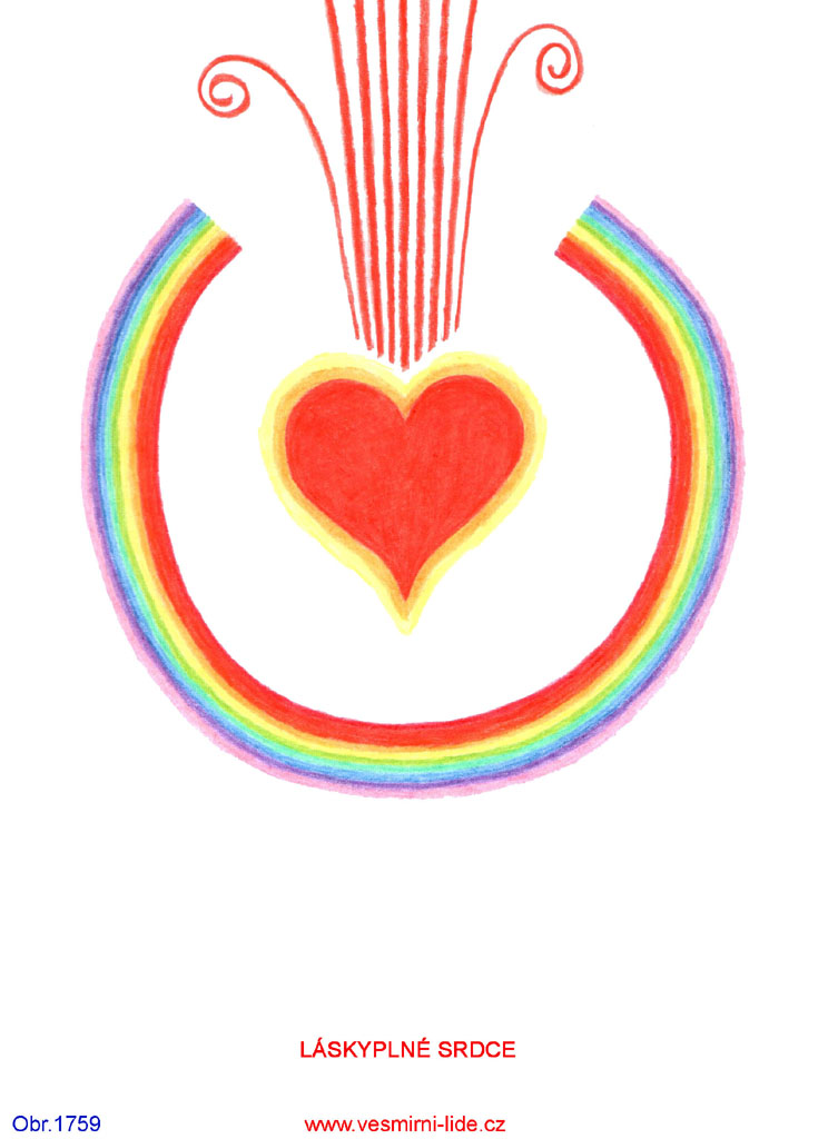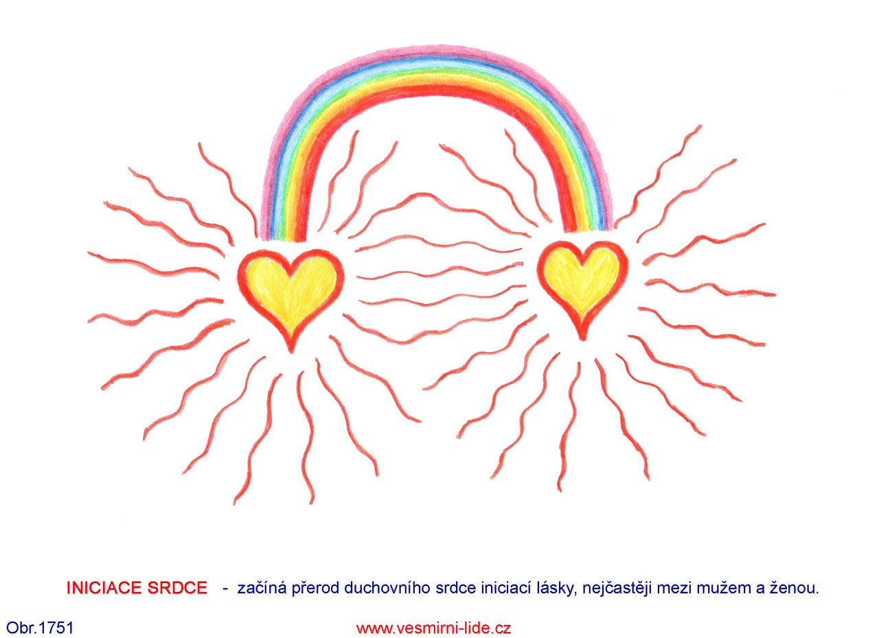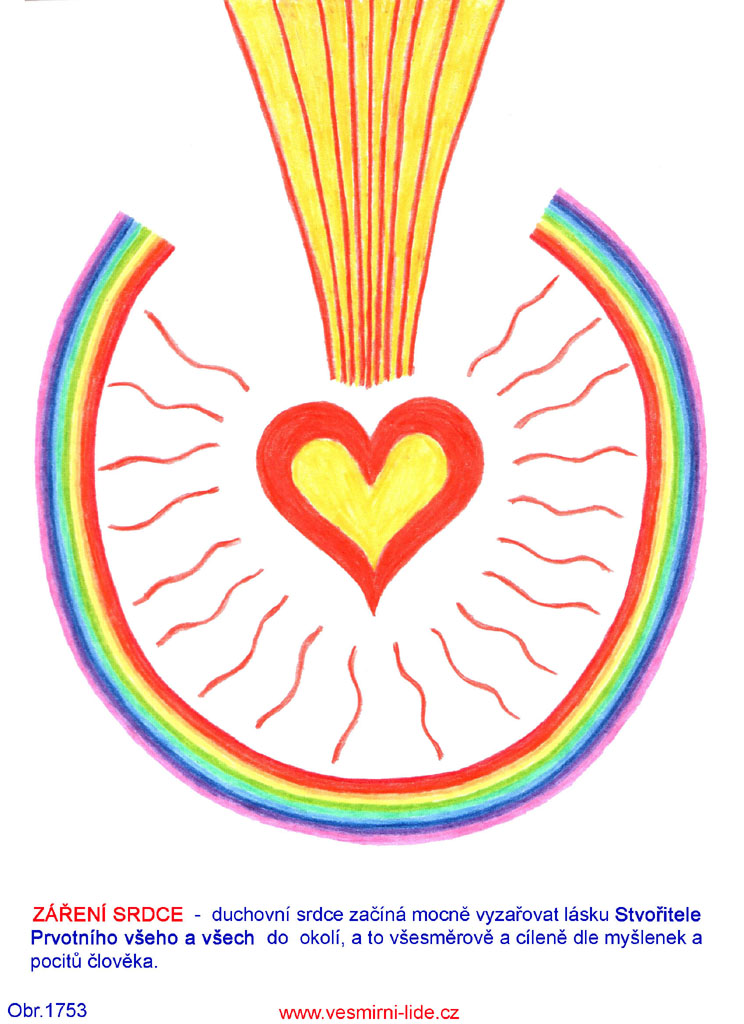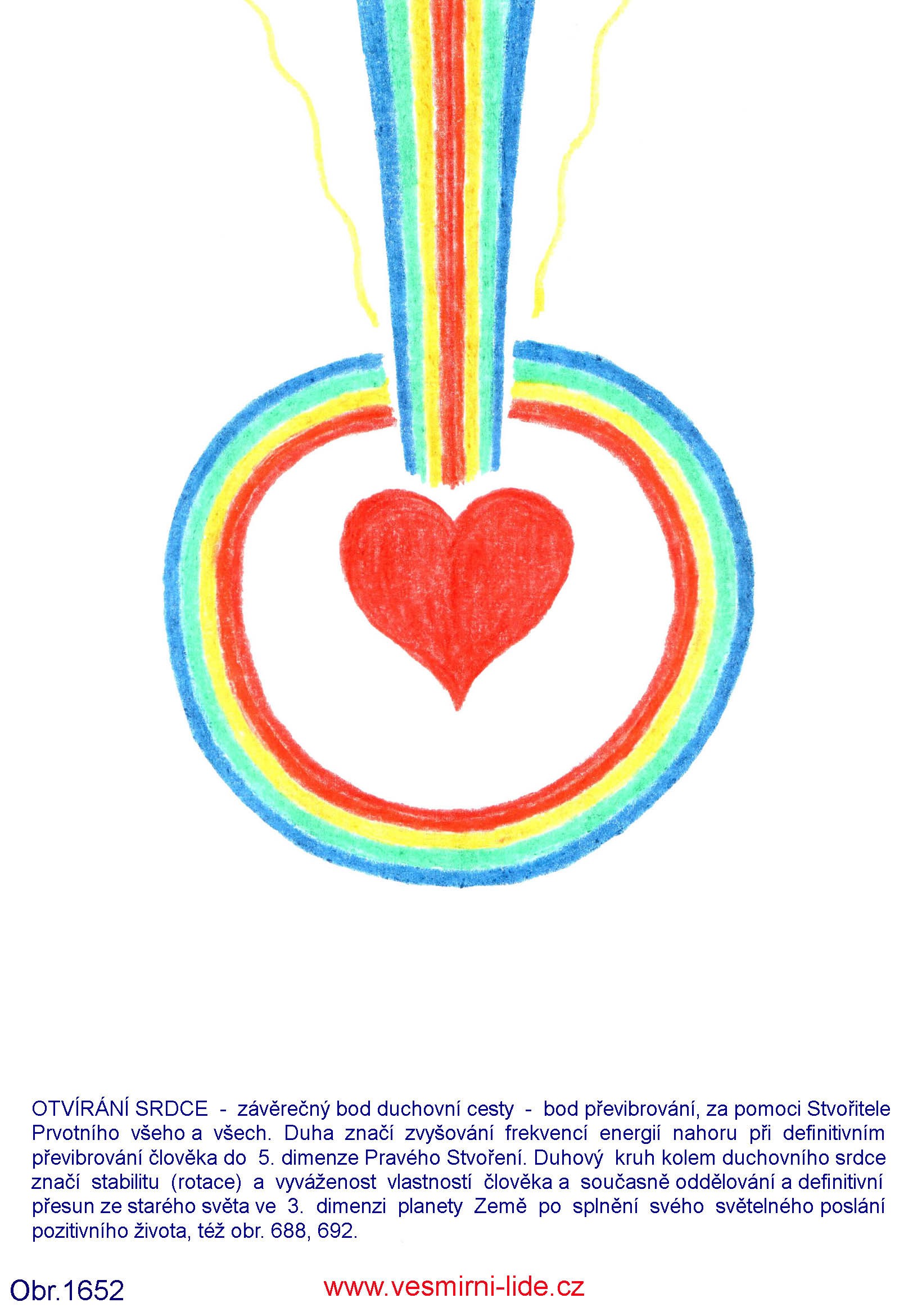 OTVÍRÁNÍ SRDCE – závěrečný bod duchovní cesty – bod převibrování, za pomoci Stvořitele Prvotního všeho a všech. Duha značí zvyšování frekvencí energií nahoru při definitivním převibrování člověka do 5. dimenze Pravého Stvoření. Duhový kruh kolem duchovního srdce značí stabilitu (rotace) a vyváženost vlastností člověka a současně oddělování a definitivní přesun ze starého světa ve 3. dimenzi planety Země po splnění svého světelného poslání pozitivního života, též obr. 688, 692.“