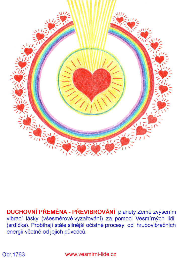 DUCHOVNÍ PŘEMĚNA – PŘEVIBROVÁNÍ planety Země zvýšením vibrací lásky (všesměrové vyzařování) za pomoci Vesmírných lidí (srdíčka). Probíhají stále silnější očistné procesy od hrubovibračních energií včetně od jejich původců.