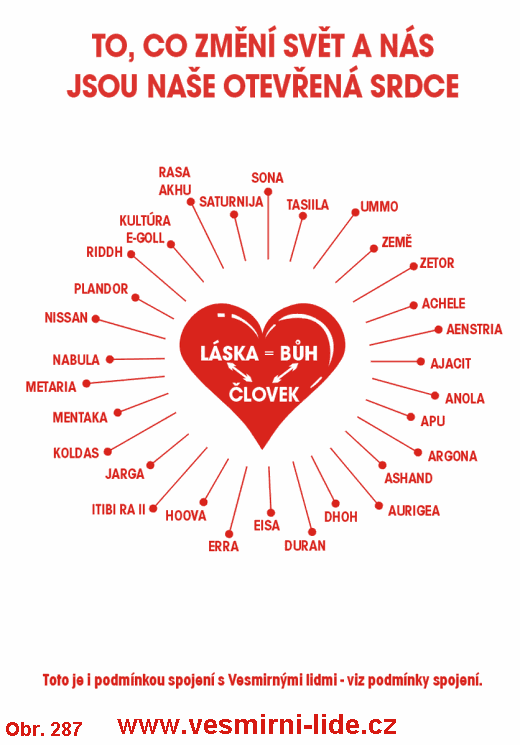 | „Tolikrát zní v textech našich slovo srdce, jako klíč lásky. Srdce je pojem duchovní Věz človíčku pozemský Jsou to vesmíry Pravé První Nebe jest duchovní Druhé Nebe je spojovací Třetí Nebe je přírodní Toto základní členění To vše v srdci máš V případě prvním srdce otevíráš V případě druhém srdce zavíráš Fyzickým srdcem myslíme Lidé na Zemi málo s láskou pracují Vlevo k pozitivnímu kanálu S láskou v srdci předal jsem |