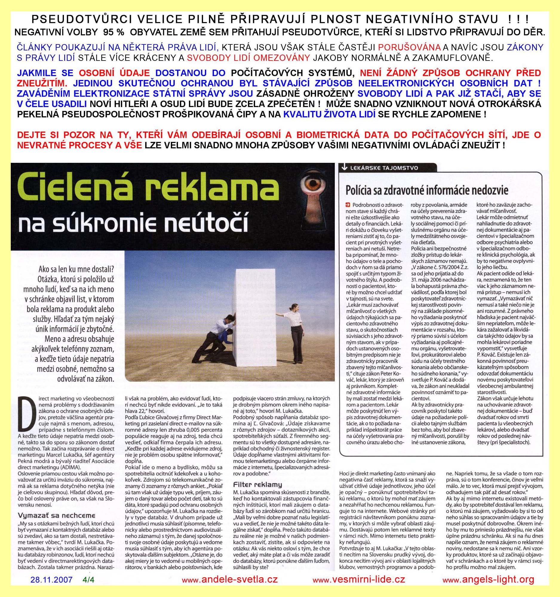 REDAKCE MAJÍ POVINNOST PUBLIKOVAT I NÁZORY, S NIMIŽ NE VŽDY SOUHLASÍ. SVOBODA PROJEVU, ZEJMÉNA SVOBODA TISKU, JE ZARUČENA ÚSTAVOU ČR, MEZINÁRODNÍM PAKTEM O OBČANSKÝCH A POLITICKÝCH PRÁVECH PUBLIKOVANÉ VE VYHLÁŠCE MZV Č. 120/196 SB. A LISTINOU ZÁKLADNÍCH PRÁV A SVOBOD VYHLÁŠENOU POD Č. 23/1991 SB. SVOBODA PROJEVU A PRÁVO NA INFORMACE JSOU ZÁKONEM ZARUČENY. KAŽDÝ MÁ PRÁVO VYJADŘOVAT SVÉ NÁZORY SLOVEM, PÍSMEM, TISKEM, OBRAZEM NEBO JINÝM ZPŮSOBEM, JAKOŽ I SVOBODNĚ VYHLEDÁVAT, PŘIJÍMAT I ROZŠIŘOVAT IDEJE A INFORMACE. CENZURA JE NEPŘÍPUSTNÁ.