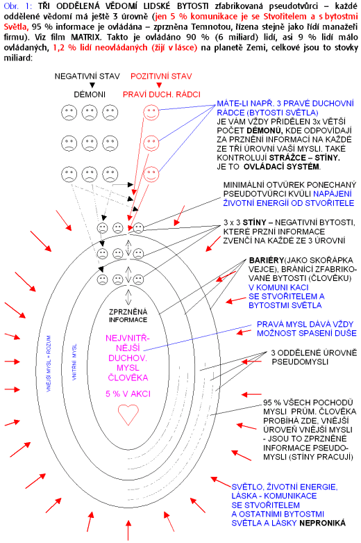 Obr. 1: TŘI ODDĚLENÁ VĚDOMÍ LIDSKÉ BYTOSTI zfabrikovaná pseudotvůrci – každé oddělené vědomí má ještě 3 úrovně (jen 5 % komunikace je se Stvořitelem a s bytostmi Světla, 95 % informace je ovládána – zprzněna Temnotou, řízena stejně jako řídí manažeři firmu). Viz film MATRIX. Takto je ovládáno 90 % (6 miliard) lidí, asi 9 % lidí málo ovládaných, 1,2 % lidí neovládaných (žijí v lásce) na planetě Zemi, celkové jsou to stovky miliard: