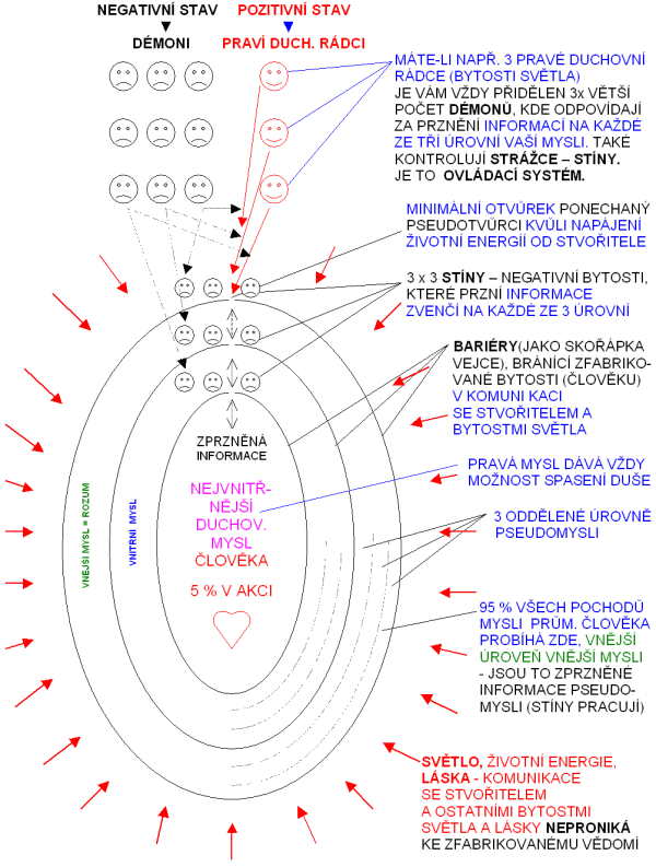 Obr. 2: TŘI ODDĚLENÁ VĚDOMÍ LIDSKÉ BYTOSTI zfabrikovaná pseudotvůrci – každé oddělené vědomí má ještě 3 úrovně (jen 5 % komunikace je se Stvořitelem a s bytostmi Světla, 95 % informace je ovládána – zprzněna Temnotou, řízena stejně jako řídí manažeři firmu). Viz film MATRIX. Takto je ovládáno 90 % (6 miliard) lidí, asi 9 % lidí málo ovládaných, 1,2 % lidí neovládaných (žijí v lásce) na planetě Zemi, v pouzdrech jsou stovky miliard bytostí: